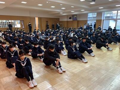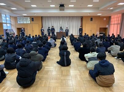 学級での朝の会終了後、多目的室で、生徒集会を行いました。