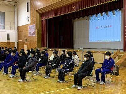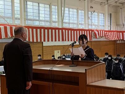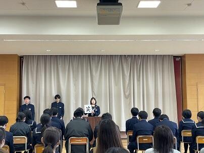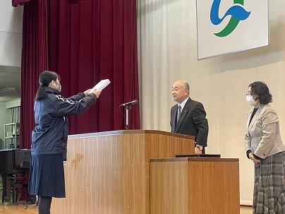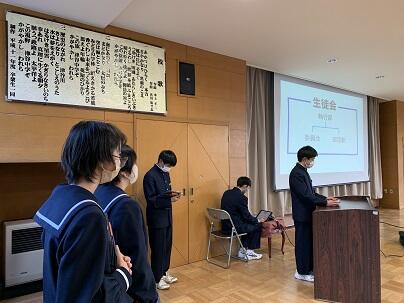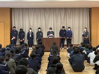 朝、新しい向が丘生徒会役員任命式と専門委員長の委嘱、新旧執行部の引継式を行いました。