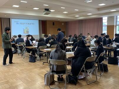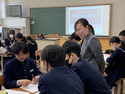 気仙沼市探究学習コーディネーターの渡邊国権さん、三浦亜美さん、インターンの大学生2名が来校し、探究のプレゼンテーションの確認などを行いました。