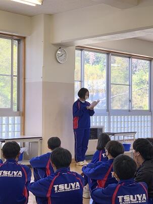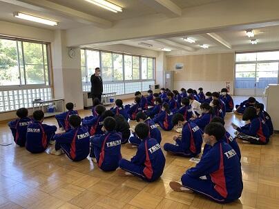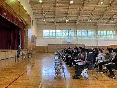 昨日昼休み、体育館で、24日(日曜日)に計画している津谷地区津波総合防災訓練についての説明を行いました。