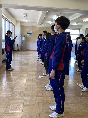 応援委員が進行をして、明日、若柳総合体育館アスパルわかやなぎで行われる県新人大会に出場する男子卓球部と女子卓球部の代表が目標を話しました。