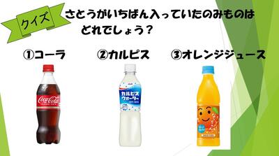 実際に,コーラ・カルピス・オレンジジュースの中でどれに砂糖が一番多く含まれているかを予想するクイズを行いました。