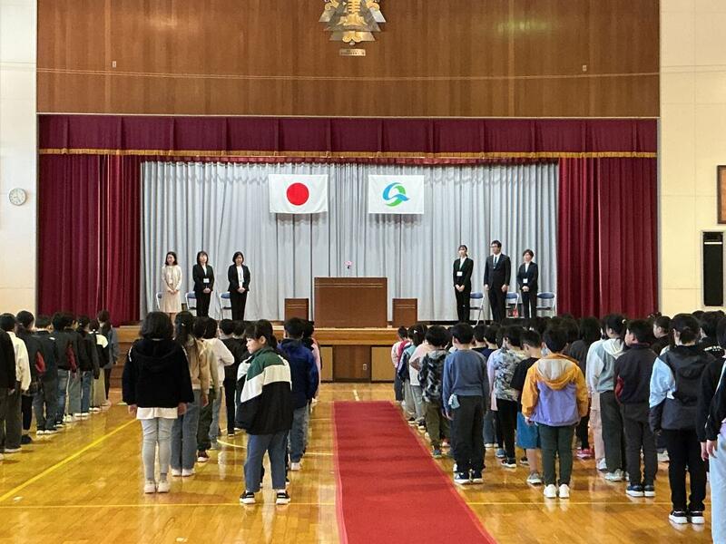春休みが明け、校舎に子供たちの元気な声が戻ってきました。披露式では、新しく赴任された先生方との対面があり、代表児童が温かい言葉で歓迎しました。始業式では、校長先生から新年度の心構えについてお話があり、その後、担任発表が行われました。緊張と喜びの交じった明るい歓声と拍手が起こり、新しい出会いに目を輝かせる子供たちの姿が印象的でした。