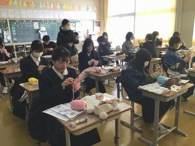 2年生の家庭科において、指編みで「アクリルたわし」をつくっています。どの生徒も集中して編んでいました。