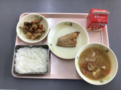 ごはん いわしのオレンジ煮 ひじきと大豆の炒り煮 うーめん汁 黒糖枝豆 牛乳 745㎉