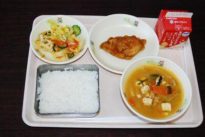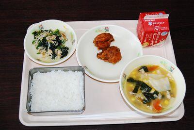 ごはん 鶏肉の唐揚げ みそワンタンスープ もやしとわかめの和え物 牛乳 759㎉