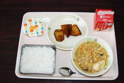 【ごはん 大学芋 マーボー豆腐 夢オレンジゼリー 牛乳 893㎉