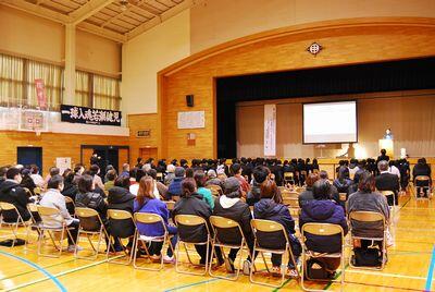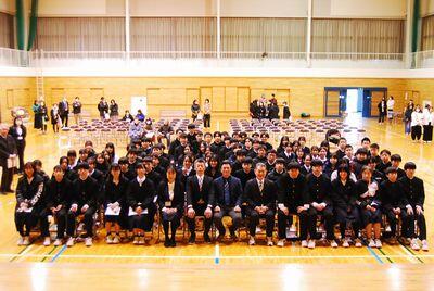 ↓ 須江先生を囲んで、全校での記念写真