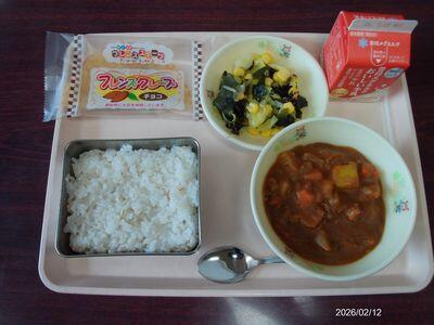 麦ごはん 海藻サラダ エッグカレー チョコクレープ 牛乳 867㎉
