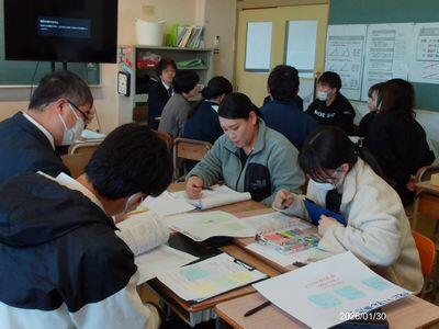生徒は、富国強兵や殖産工業政策、文明開化などの言葉の意味を調べ、グループで、江戸時代までの伝統的な生活様式から、欧米の文化が導入され、人々の生活が大きく変化したことについて熱心に調べていました。