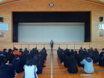 今日は集会を開き、校長から、震災当日の様子を当時の2年生男子生徒が書き残した作文を紹介しました。いかに自分たちで為すべきことを探して活動したのかが詳細に書かれていた作文です。15年後の後輩たちの心に響いてくれるといなぁと思いながら読み上げました。