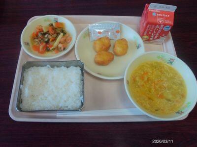 ごはん シャークナゲット チンゲン菜のオイスター炒め 中華コーンスープ 牛乳 873㎉