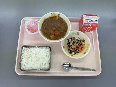 ごはん、牛乳、ひじきのサラダ、チキンカレー、さくらのお祝いゼリー