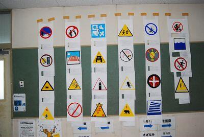 しかし、2階の様相は一転。卒業式モードから通常の日常生活に戻っており、2階正面掲示板には2年生の美術作品「ピクトグラム」が掲示されていました。ピクトグラムとは、絵や図形を使って情報や意味を視覚的に伝える記号のことです。文字や言葉に頼らず、誰でも直感的に理解できるように作られているため、言語や文化、年齢の違いを超えて情報を伝えることができます。熊や蜂への注意喚起など、思い思いの作品が並んでいました。