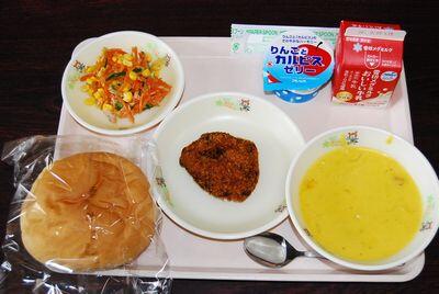 横割り丸パン チキンみそカツ にんじんサラダ パンプキンスープ リンゴゼリー 牛乳 817㎉