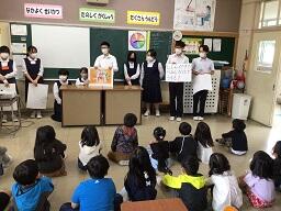 9月22日の午前中、本校3学年の生徒が階上小学校を訪問し、小学生と一緒に防災について学びました。はじめに生徒が予め準備したカルタや塗り絵、紙芝居、○×クイズをもとに小学生への防災普及活動を行った後、小学4年生の防災マップづくりの授業に参加させていただきました。