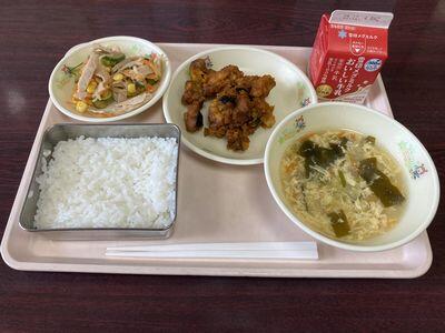 ごはん かぼちゃと揚げ鶏の甘辛和え 切り干し大根のサラダ わかめとたまごのスープ