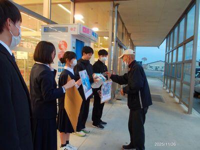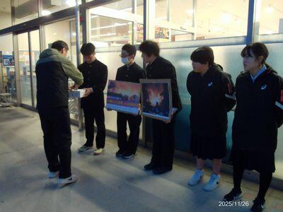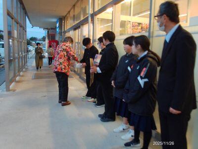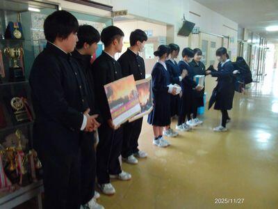 先週発生した大分市佐賀関大規模火災のニュースを見て、3年生の有志が募金活動の提案をし、賛同した9名が、昨日夕方に学区内のクリエみうら階上店様の店頭で、今日は登校時間に合わせて昇降口で募金活動を行いました。たくさんのかたに「頑張ってね」と声を掛けていただき、生徒たちはとても嬉しそうでした。