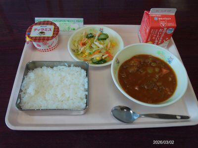 ごはん さきいかのかみかみサラダ ビーフカレー ティラミス 牛乳 941㎉