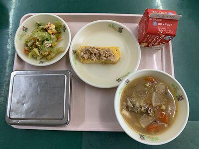 わかめごはん、牛乳、厚焼き玉子のそぼろあんかけ、ツナのサラダ、ピリ辛みそ汁