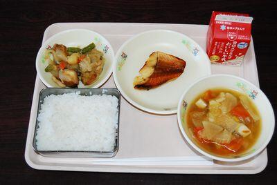 ごはん 赤魚西京焼き 油麩入り肉じゃが せんべい汁 牛乳 769㎉