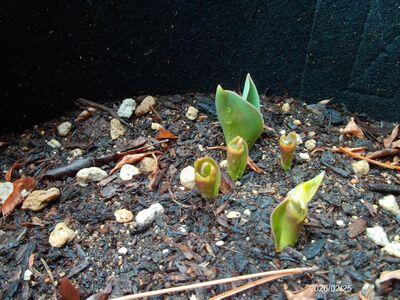 ↓ 間もなく3月。今日の雨で一気にチューリップの芽がぐんとのびました。ビオラもいっそう成長しています。もうすぐ春です。芽吹きの季節は元気が出ますね。