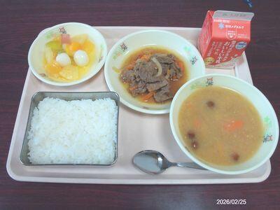 ごはん セルフ牛丼の具 なめこのみそ汁 フルーツ白玉 牛乳 830㎉