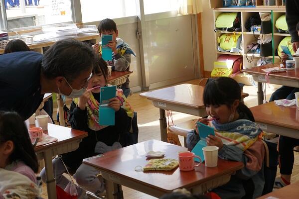 1年生で歯科校医佐藤先生をお迎えして歯の大切さを学ぶ授業「歯の王様を磨こう」を実施しました。歯の王様(6才臼歯)がなぜ王様と呼ばれているのか,王様なのにどうしてむし歯になりやすいのかを学んだ後,カラーテスター(2色染め出し液)で歯垢染め出しをしました。まずは自分の指にガーゼを巻いてハブラシにしてみがき落としました。それでも落とし切れなかった汚れはハブラシでしっかりみがきました。