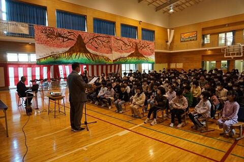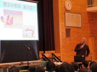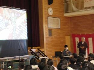 3月11日、みやぎ鎮魂の日。震災当時、市内の小学校の校長,市教育委員会学校教育課長をされていた小野寺正司先生をお迎えして「震災の風化を防ぐ」と題して講話をいただきました。震災当時の様子や,心の不安を訴えた子どもたちがいたこと,その不安を取り除くために「心の復興プロジェクト」として,絵を描き表現することによる心の安定化を図ったこと,そのことにより子どもたちが笑顔を取り戻していったことなどをお話しいただきました。講話を聞いた子どもたちは,「お家の人から聞いていた事と関連づけて今日の話を聞いた。」「14年前のことを初めて知った。次にこういうことがあっても自分の命を守れる行動をしたい。」「高校生の作った詩が心に残った。心に沁みた。災害への準備 自分の命は自分で守る。」等の感想を持っていました。