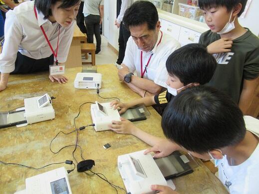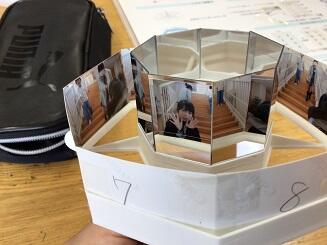 武蔵野美術大学非常勤講師の先生においでいただき、4・5年生を対象に、映像の起源を体験する授業として、2つの体験活動を行っていただきました。1つ目のおどろき盤(フェナキスチスコープ)では、円盤型の型紙に自分で絵を描き、それを回転させることで絵が動いて見える仕組みを体験しました。2つ目のプラクシノスコープでは、デジタルカメラを使用し、連続性のある画像を写真に撮り、それを装置にセットして回転させ、鏡に映りこむ映像を見ることで動いて見えるという体験をしました。グループで相談して連続性のある8コマの写真を撮り、装置にセットして回転させると「わ!動いて見える!」と歓声が上がり、楽しく活動しながら映像の不思議について学ぶことができました。電気を使わなくても静止画が動画に見えるアニメーション装置の面白さ、過去のテクノロジーが現在につながっていることを体験的に学ぶ貴重な機会となりました。