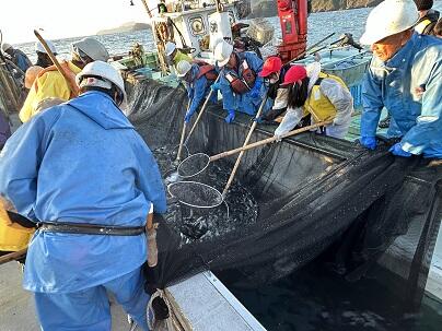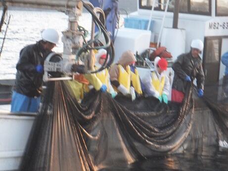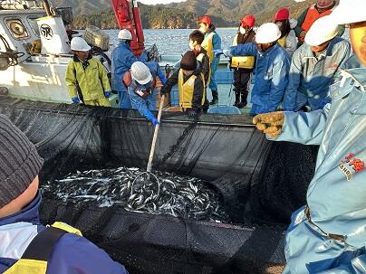 5年生が定置網起こし体験をしました。サケ,イワシ,タチウオ,イカなど,多くの種類の魚をとることが出来ました。定置網起こしの漁法の体験と共に,とれる魚の種類から,水温などの環境の変化をはじめ様々なことに気付いていたようです。