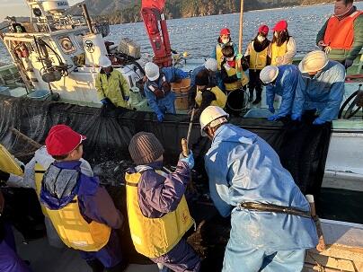 2月2日,6年生が本校のカキ筏で育ったカキをむく作業を体験をしました。4年生の時に種をつけ育ててきたカキを収穫し,身をナイフで丁寧にむきとりました。この日は親子での作業でした。体験した児童は「収穫できてうれしい」,「カキフライや鍋物にして食べるのが楽しみ」などと感想を述べていました。これまで3年間,学校支援委員の方にお世話になって育ててきたカキの収穫を喜び合いました。
