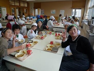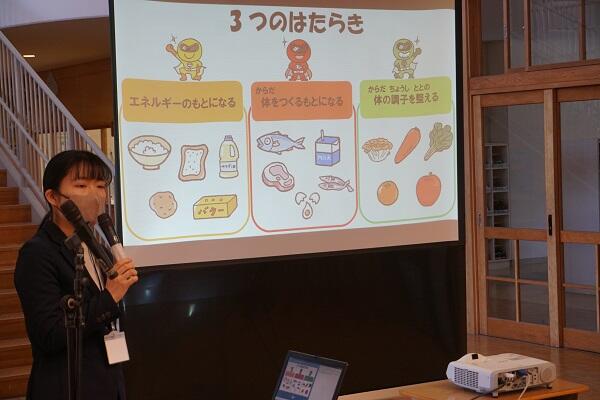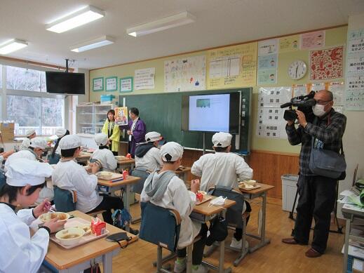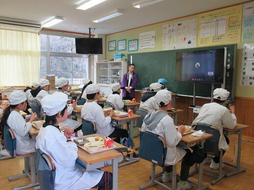 1月24日から1月30日までの1週間は「学校給食週間」となっています。これにちなんで1月28日(火)は朝会で給食感謝の会を実施しました。中央給食センターから栄養教諭の岩渕先生をお招きし,子どもたちが一人一人書いた,栄養士,調理員など給食に関わっている方々への感謝の手紙を渡しました。岩渕先生からは,給食の三つの栄養バランスについて説明していただき,給食を残さず食べて丈夫な体を作ってほしいというお話しがありました。 また,給食時には24日の唐揚げの食材提供をしていただいた,株式会社オヤマ様の方にお越しいただき,6年生に,タンパク質を多く含む食材であることについてお話しをしていただきました。また,この食材を監修したユーチューバ-,オガトレさんのお話もオンラインでお聞きしました。