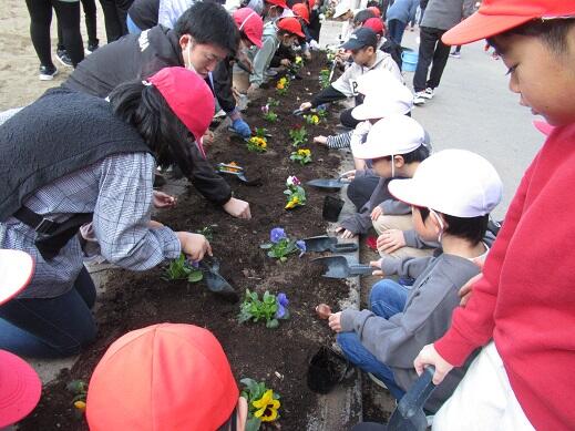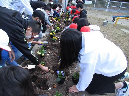11月13日,朝全校緑化活動を行いました。児童全員で校舎前の花壇にパンジーの苗を植えました。上学年と下学年児童が協力しながら丁寧に植えていきました。苗をすべて植えた後は,環境委員の児童が個々も丁寧に水やりをし,苗を落ち着かせていました。来年きれいに咲き誇るのが今から楽しみです。