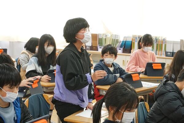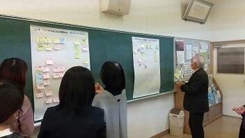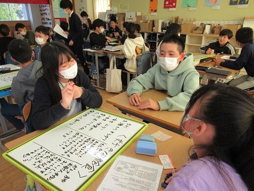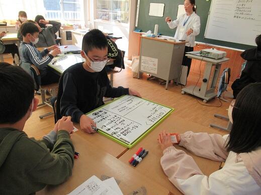 6年生でホワートボードミーティングの授業を行いました。ホワイトボードミーティング認定講師山田美保子さんをお招きし2時間実施しました。子どもたちは,「お気に入りの給食」や「海と生きるとは?」,「唐桑の幸せ」の話題についてホワイトボードを使って積極的に話合いをしました。この授業では,体験するだけでなく,自分たちもファシリテーターとしての技術を学ぶ目的もありました。参加者の意見をホワイトボードに書くので何を話しあっているのかが明確になり,子どもたちも効率的,効果的な話合いができていました。今回学んだことを今後の海と生きる探究活動などに生かして行きます。