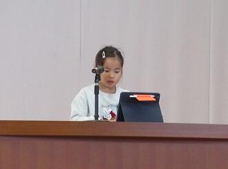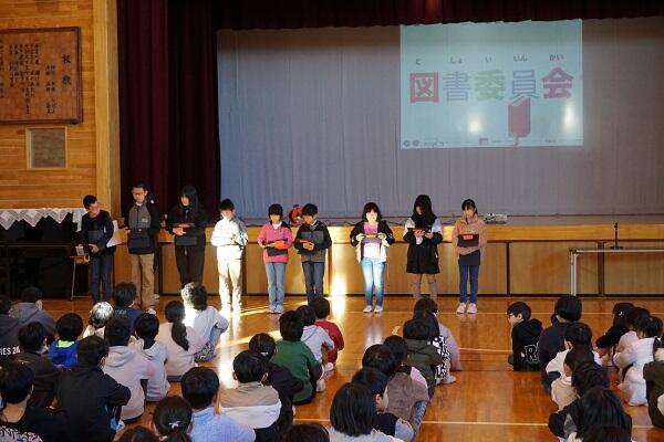 図書員会の児童朝会を行いました。図書委員の仕事として,「紙芝居の読み聞かせ,大空号の貸し出し本の回収,おすすめの本のお知らせ」をしていることを紹介しました。また,図書委員会からのお願いとして「もっと図書室を利用してほしいこと」を伝えていました。多読賞受賞者の紹介と表彰のあと,「図書室利用者数」,「図書の分類番号」等についてクイズを出し,図書室や図書への興味を高めていました。クイズで楽しみながら,図書委員の仕事内容や図書室についてよく理解できる集会でした。
