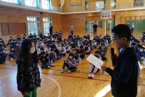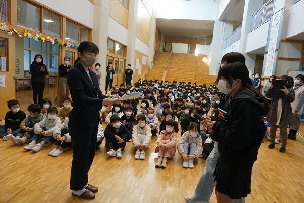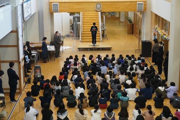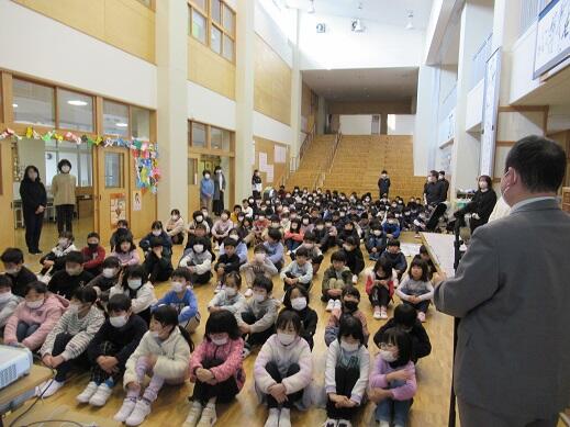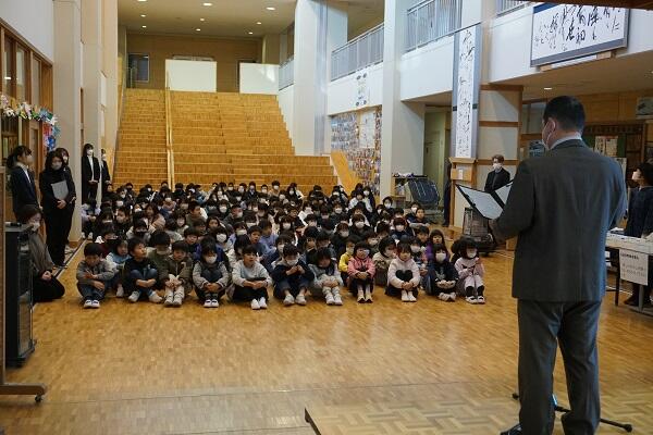 冬休み前の講話朝会をしました。校長からは子どもたちに,夏休み明けからの頑張りで一回りも二回りも成長できたこと,目標を振り返り,できたことはおうちの方々や先生に褒めてもらい,できなかったことはこれから伸びるチャンスと思い取り組んでほしい,ということを話しました。また,冬休みは新年の目標を立てること,命を大切に過ごすことの二つのことをしてほしいと伝えました。児童代表の1年生は,これまで頑張ったこととして学習発表会の「サラダでげんき」,算数の勉強に楽しく取り組んだことを発表し,入学してくる1年生に優しく学校のことを教えてあげる2年生になりたいと抱負を述べました。