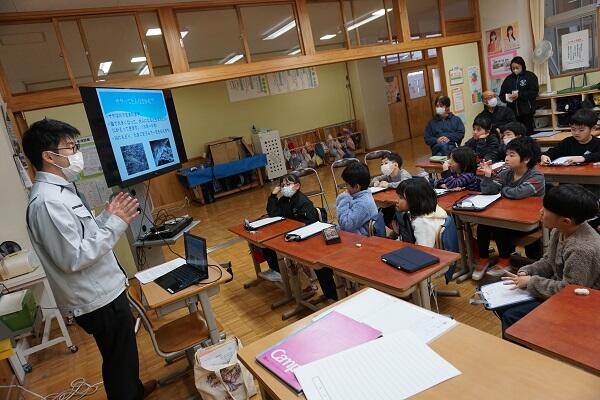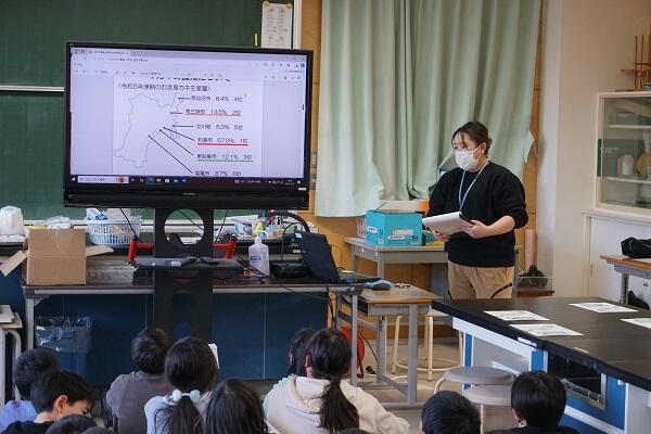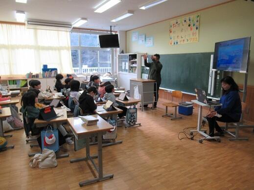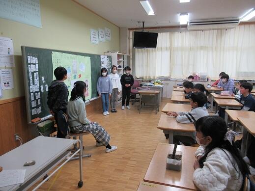 3年生が総合的な学習の時間で,ゲストティーチャーをお呼びし,わかめの成長について講話をお聞きしました。初めは10センチくらいのわかめの赤ちゃんをロープにくくりつけ,最終的には160センチほどまで成長すること,12月~2月頃の3ヶ月間で育てるが,一年放置すると腐ってしまうこと,わかめは5つの部位に分けられることなどをお聞きして,子供たちは大変驚いていました。写真や動画,クイズ,わかめの実物など様々な方法で説明してくださり,大変楽しく,勉強になりました。子供たちは,身近な漁師さんに来ていただいたからこそ,真剣に,そして興味津々で話を聞いていました。講話の後は「わかめ食べたくなってきた。」「買って帰ろうかな。」という声が聞かれました。