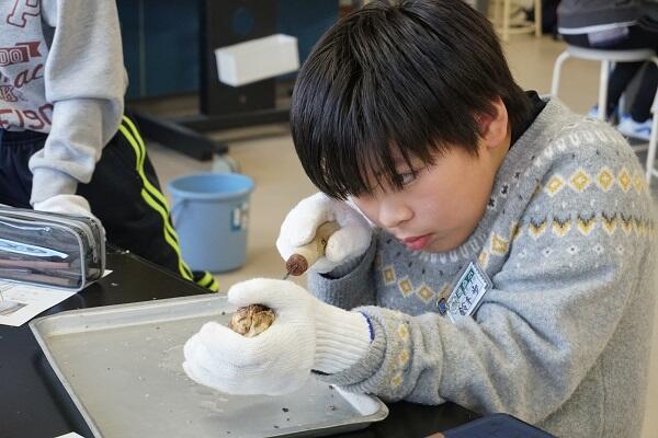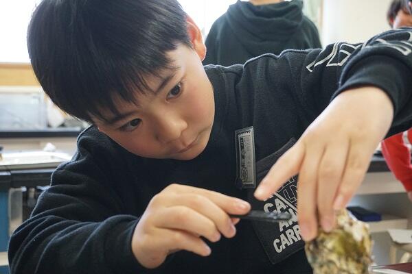 12月12日(木),宮城県水産技術総合センター気仙沼水産試験場の金澤さんと鈴木さんをお招きし,カキの解剖体験を行いました。今年度からカキの養殖体験を始めた4年生にとってとても興味をそそられる活動だったようです。自分でカキをむく体験も兼ねていましたが,上手にむき,かきの身や内臓の様子を夢中で観察していました。動いている心臓を見て感動する子供もいました。ある子供は「今までカキのことを苦手に思っていたけれど,今日の活動でカキのことが好きになりました。」と目を輝かせていました。