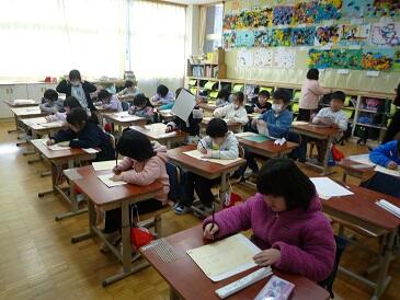 校内席書大会を実施しました。1・2年生は硬筆,3年生以上は毛筆と硬筆に分かれて取り組みました。どの児童も1時間,集中して粘り強く自分の作品を仕上げようとしていました。でき上がった作品は校内書きぞめ展の際に掲示して保護者の皆様に御覧いただきます。