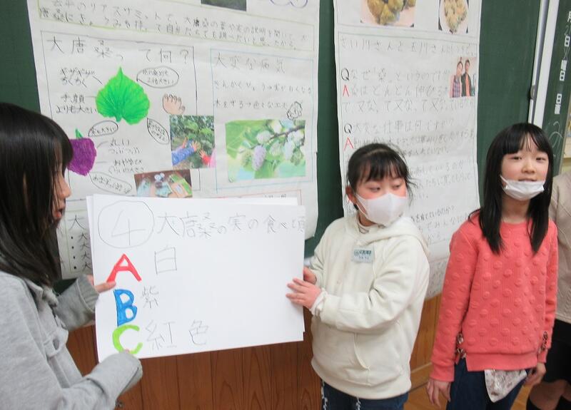 3年生が「海と生きる探究活動」の学習で,大唐桑の畑を見学しました。子どもたちは大唐桑栽培愛好会の方による説明を興味を持って聞いていました。また,大唐桑を使ったお茶やうどんなどの試食もさせていただきました。