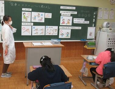 2年生で食育の授業を行いました。佐々栄養教諭の指導で,「食事のマナー」について考えました。姿勢,食べ方,食べるときの気持ちなどを考えました。 学習の最後にはこれからの食べ方のめあてを「会話と姿勢に気を付けマナーを守って楽しく食べよう!!」としました。めあてに気を付けてたくさん食べ,元気に生活してほしいと思います。