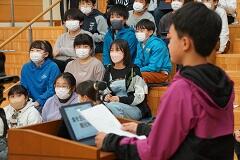 5・6年生がオンラインでの海洋教育こどもサミットに参加しました。4校ずつのグループに割り振られた発表の時間は6年生の3名が「唐桑の特産品を生かす町づくり」「食を生かした観光地」「唐桑の生かせるところ」をテーマに個人で探究してきたことについて発表しました。その後は5・6年生全児童が参加して、各校の代表の発表について質問や感想を述べたり、海洋教育のテーマについて意見を交換したりしました。自分たちで探究したことについて発表したり、他校の実践を聞いたりすることは互いに海洋教育を学ぶものとしてよい刺激になったことと思います。今回の成果を1月に行われる「リアスサミットin唐桑」に生かしていきたいと思います。