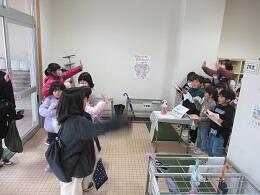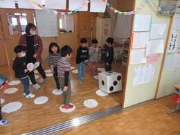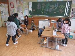 1年生は唐桑小児童が事前に準備していた大きな双六や秋の材料を使ったゲームをしてふれあいました。5年生は野外活動で一緒に活動したグループごとに校舎内探検をしました。