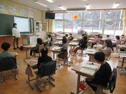次の時間には,合同授業を行いました。1年生は中井小学校千葉教諭の国語の授業,5年生は唐桑小阿部教諭の算数の授業でした。緊張しながらもいつも以上に集中して話を聞いたり,発表したり,教え合ったりして取り組んでいました。授業後には児童から「一緒に授業するのは楽しい」との感想が聞かれました。
