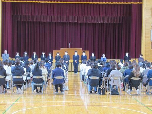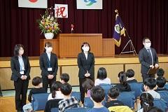 引き続いて転入職員の披露式,1学期始業式が行われました。今年度は10名の先生方をお迎えしました。
