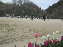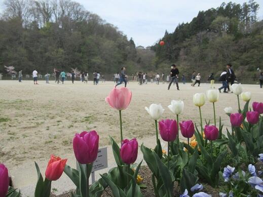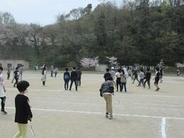 統合により児童数が増えました。それを感じられるのが休み時間の校庭遊びの時です。特にドッジボールは大人気です。多いときは50人ぐらいが一緒に遊んでいます。昨年度子どもたちが植えたチューリップが満開で子どもたちを見守っているようです。