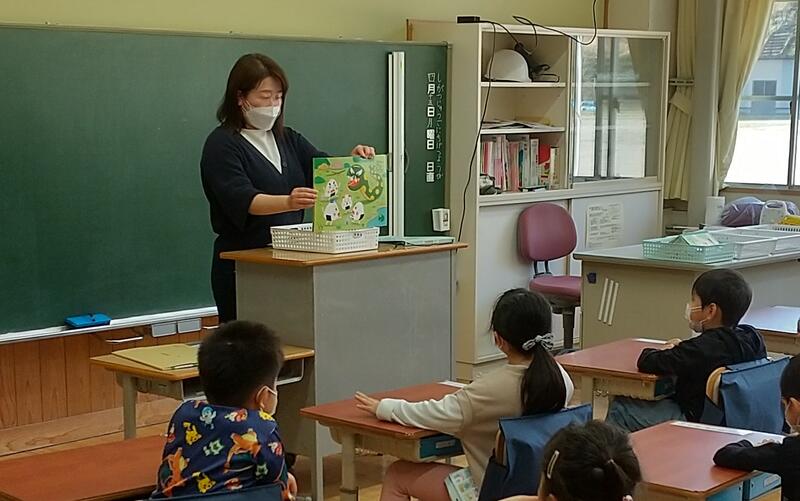 1年生の朝の様子です。子どもたちは、担任の紙芝居の読み聞かせに夢中です。興味津々の眼差しで絵を見つめ、物語に耳を傾けます。指さし、驚きや喜びを表情で表現します。時にはキャラクターの名前を口に出して喜び合い、一緒に物語の世界に入り込んでいます。
