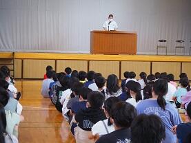 6月12日(水),朝の時間には,「唐小防災の日」の講話がありました。46年前の宮城県沖地震があったこの日,安全担当主幹が子ども時代に体験した話や東日本大震災の時に,訓練していても慌ててしまったという話をし,自分事ととして訓練に臨む大切さを話しました。