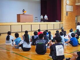 児童朝会は各委員会が担当し,委員の紹介や活動紹介などを行います。今回は保健委員会の担当でした。保健委員会は活動の紹介と保健に関するクイズを行いました。 熱中症にならないための方法、鼻血の対処法などのクイズでは、多くの児童が知らなかった情報もあり、子供たちは驚いた様子でしたが、楽しみながら保健の知識を深めていました。